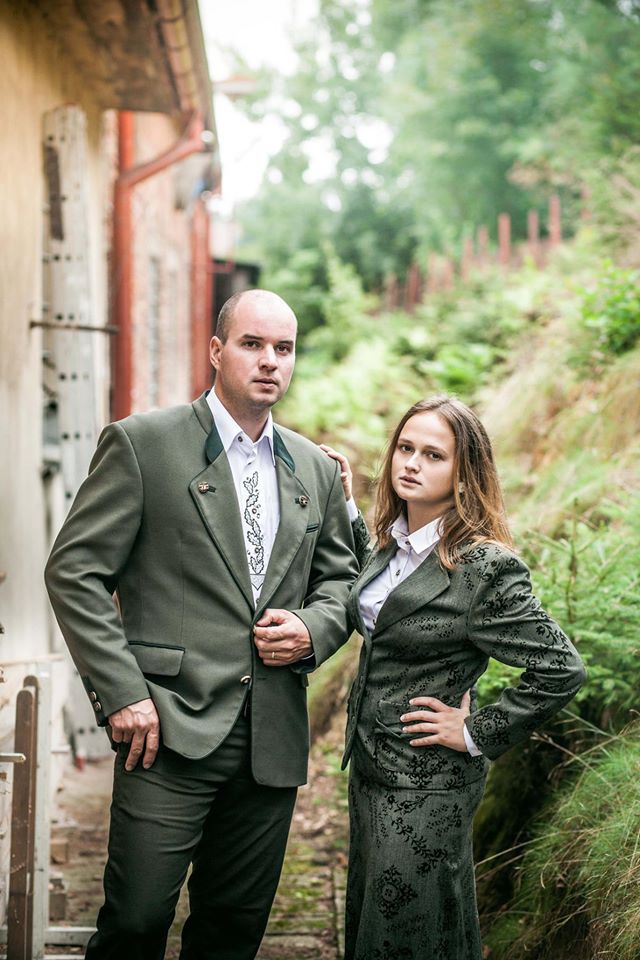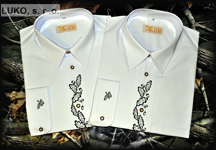 Pánská košile s dlouhým rukávem ze směsového materiálu 60% bavlna/40% polyester (jedná se o technický polyester, který má tu výhodu, že je prodyšný) s výšivkou tmavozelené barvy s dubovým motivem na léze a na pravé manžetě, střih SLIM FIT (zúžený střih).