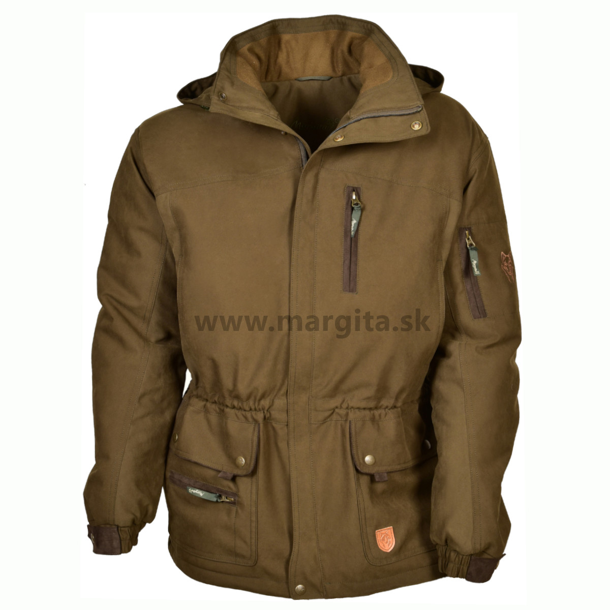 Pánska poľovnícka zimná bunda VIHORLAT je v olivovej farbe. Je kombinovaná tmavohnedým materiálom (okolo vreciek a rukávoch). Bunda je vetruodolná a nepremokavá vďaka membráne. Samotný materiál sa skladá z dvoch vrstiev, ktorý je odolnejší vďaka nylonovým vláknam. Vnútorná strana tohto materiálu je príjemný fleece. Bunda je zložená z troch vrstiev – stredná vrstva je izolácia Climashield ® Apex 100.