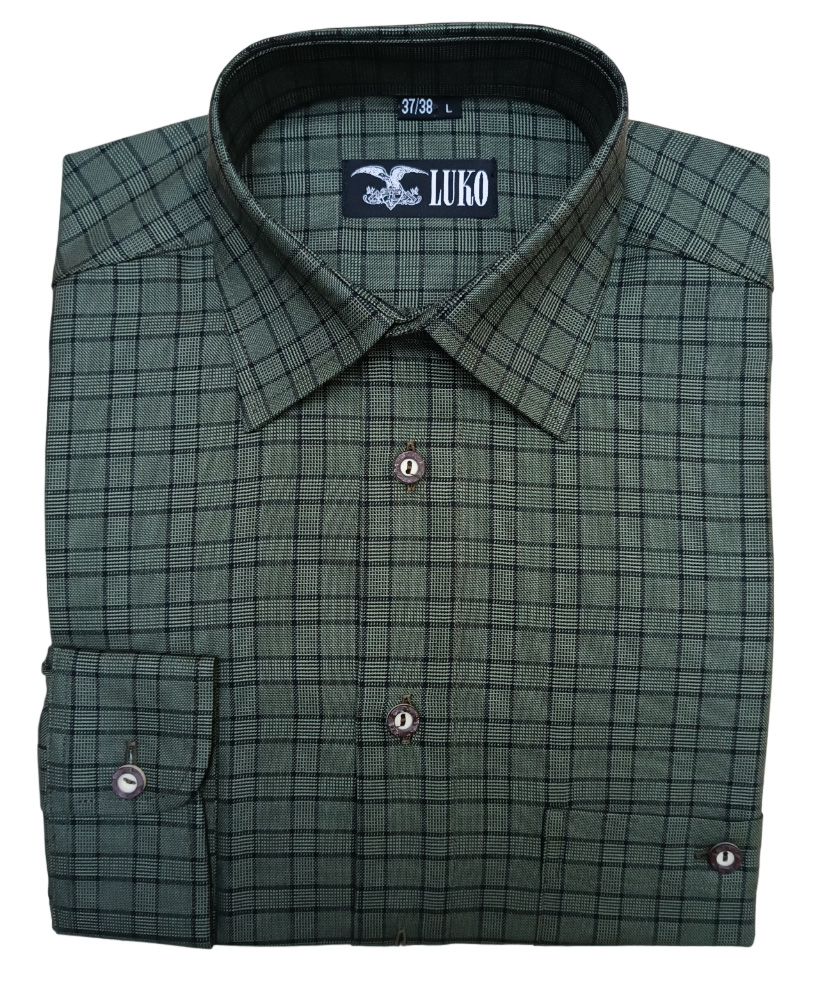 Košile má rovný střih, jednu kapsu a knoflíky z imitace paroží. Samozřejmostí je i náhradní knoflík.
