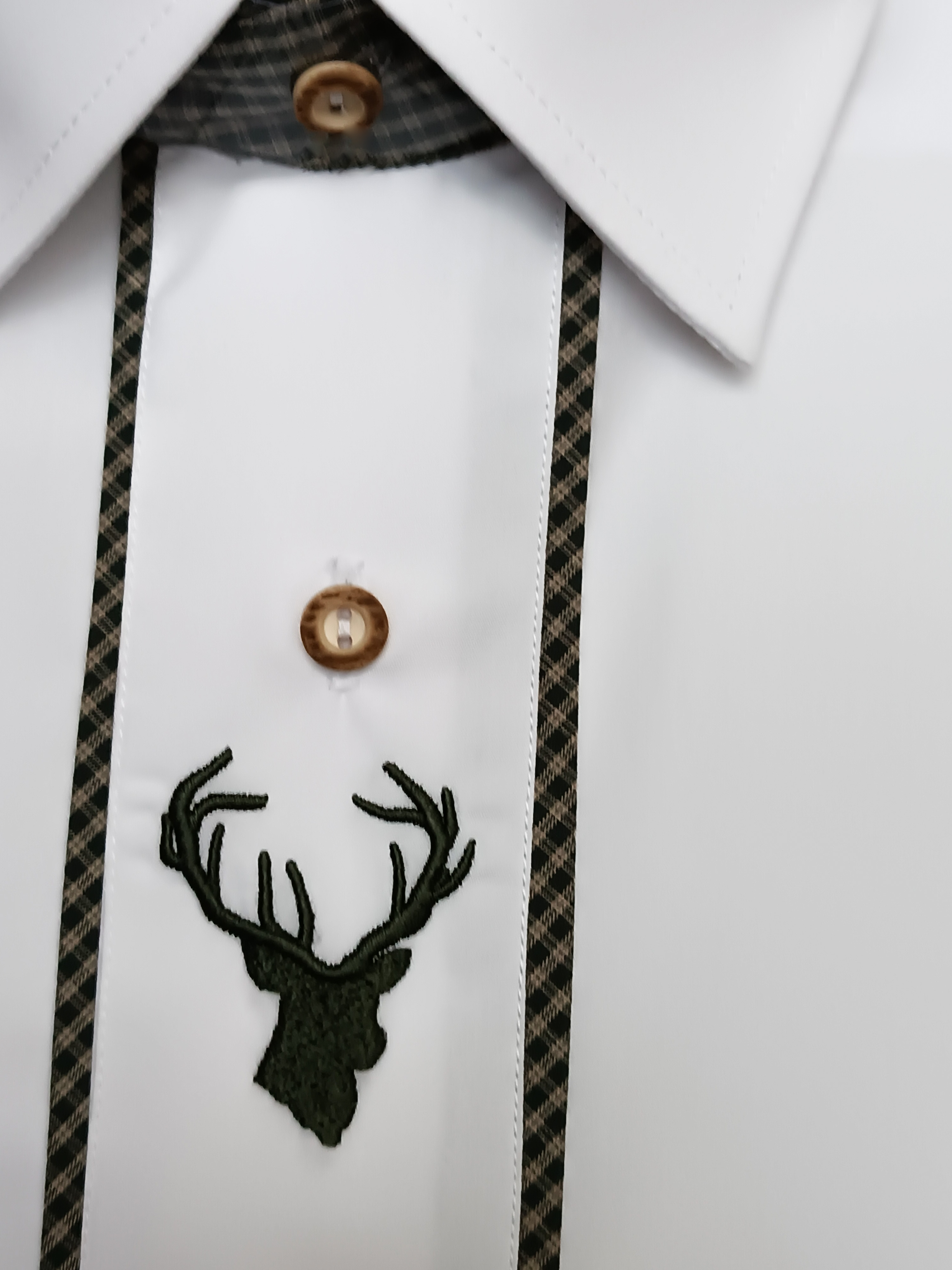 Oblíbená pánská košile bílé barvy s výšivkou jelena a prodlouženým rukávem z vysoce kvalitní 100% bavlny, snadno žehlitelná.