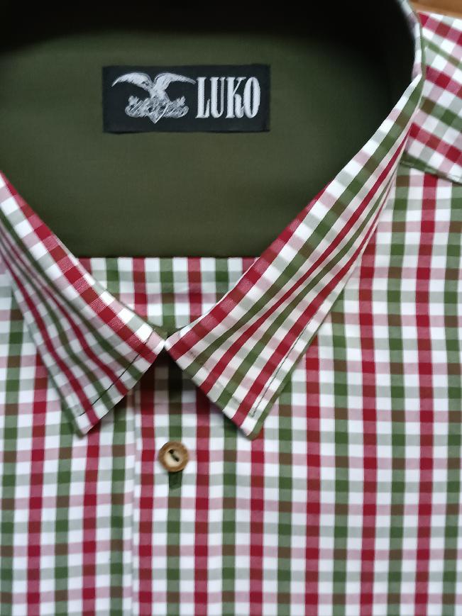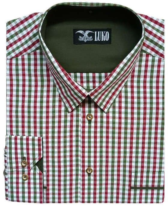 Elegantní bílá pánská košile s dlouhým rukávem ze 100% bavlny s kombinací na na límci, střih regulár. Košile má červeno zelené káro a knoflíky z imitace paroží (plast, stálobarevné, vysoce odolné).