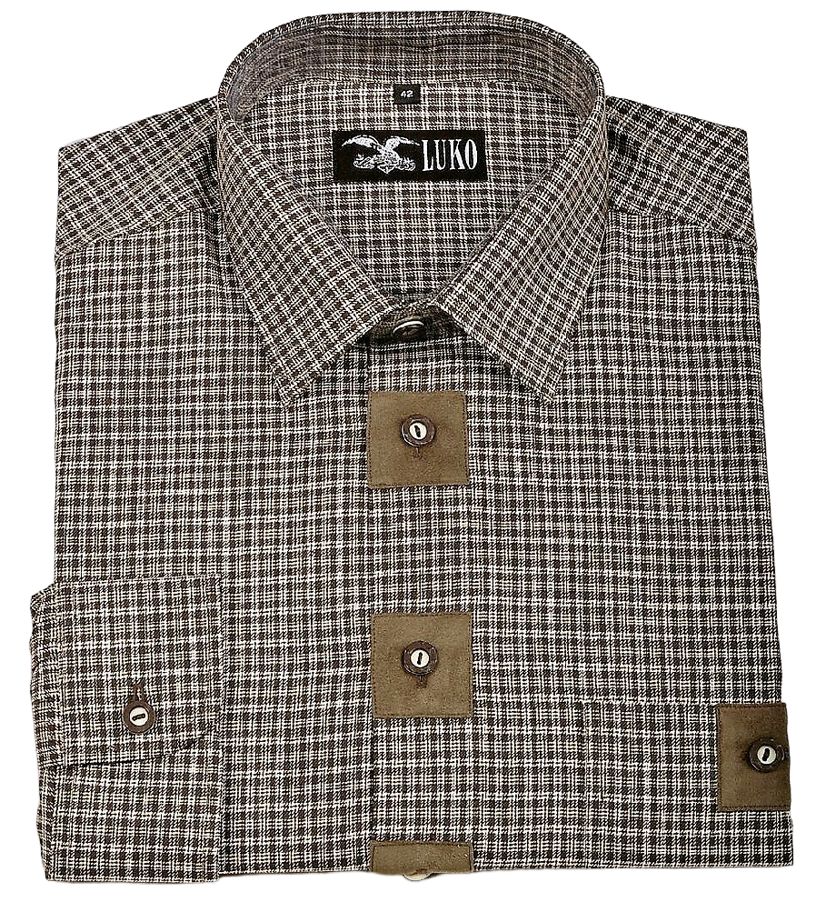 Oblíbená pánská košile s dlouhým rukávem z drobného zeleného kára ze 100% bavlny s aplikacemi na předním díle z imitace kůže. Příjemná bavlna s úpravou easy care (protimačkavá úprava) dává záruku snadné údržby. Materiál je z firmy, která je držitelem certifikátu kvality ÖkoTex.