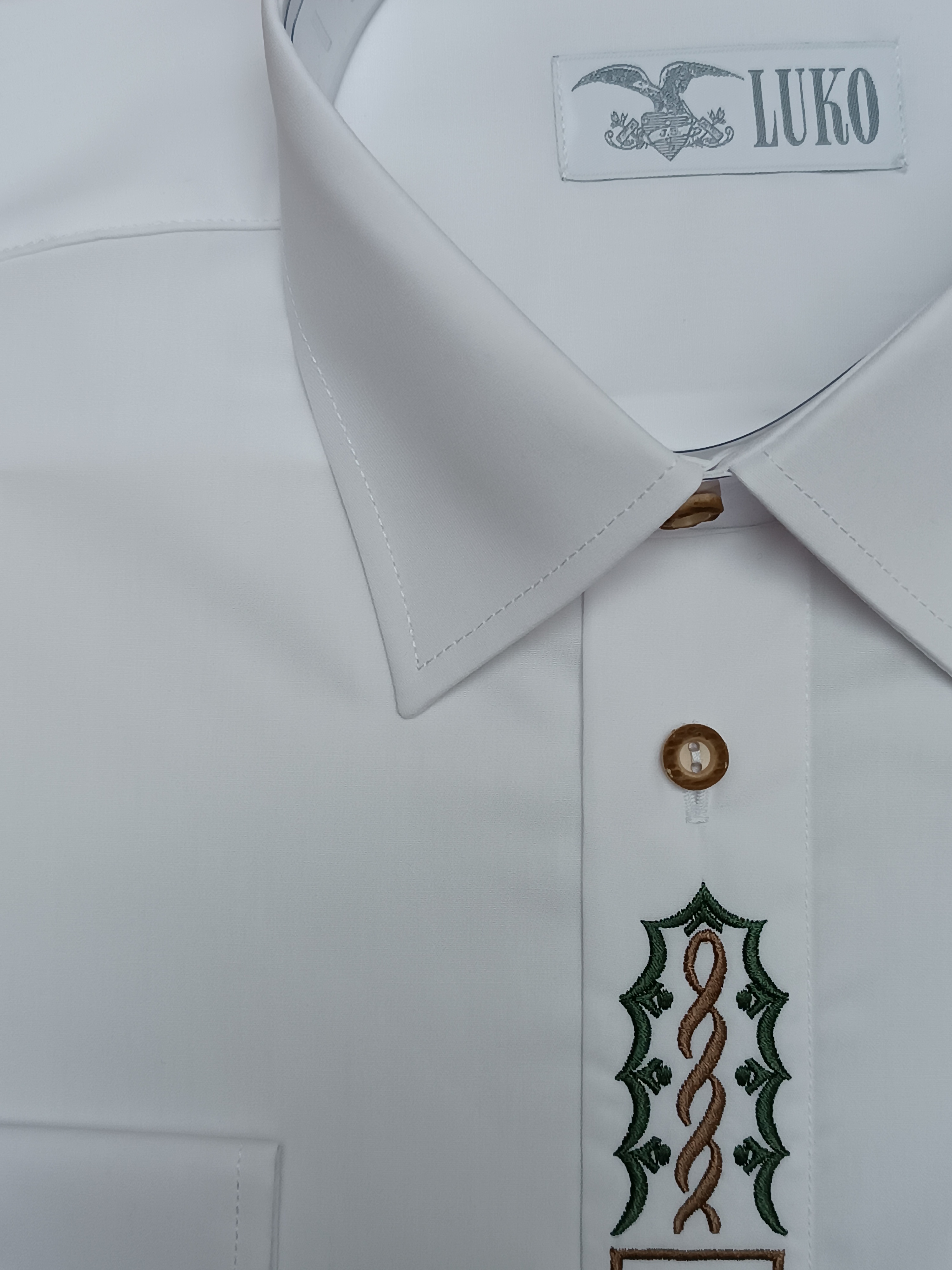 Pánská košile s dlouhým rukávem z luxusní 100% bavlny s úpravou non iron s výšivkou. Velmi příjemná bavlna s úpravou pro snadnou údržbu. materiál je od firmy, která je držitelem certifikátu ÖkoTex. košile má na předním díle výšivku, která celou košili oživuje.