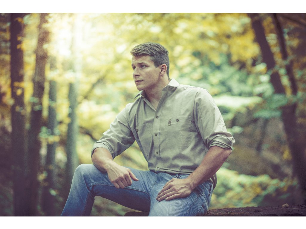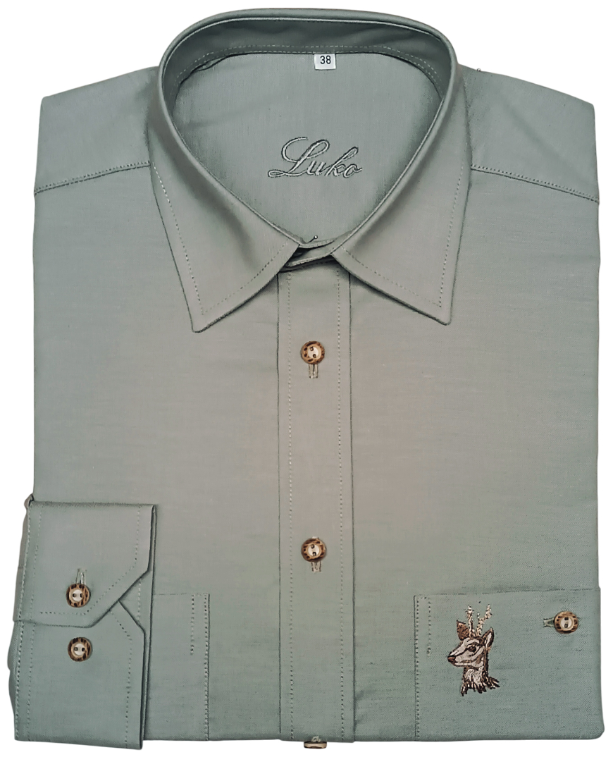 Pánská košile s dlouhým rukávem ze směsového materiálu 85% bavlna/ 15% polyester. Materiál je v provedení v zelené barvě s ozdobnou výšivkou srnečka.