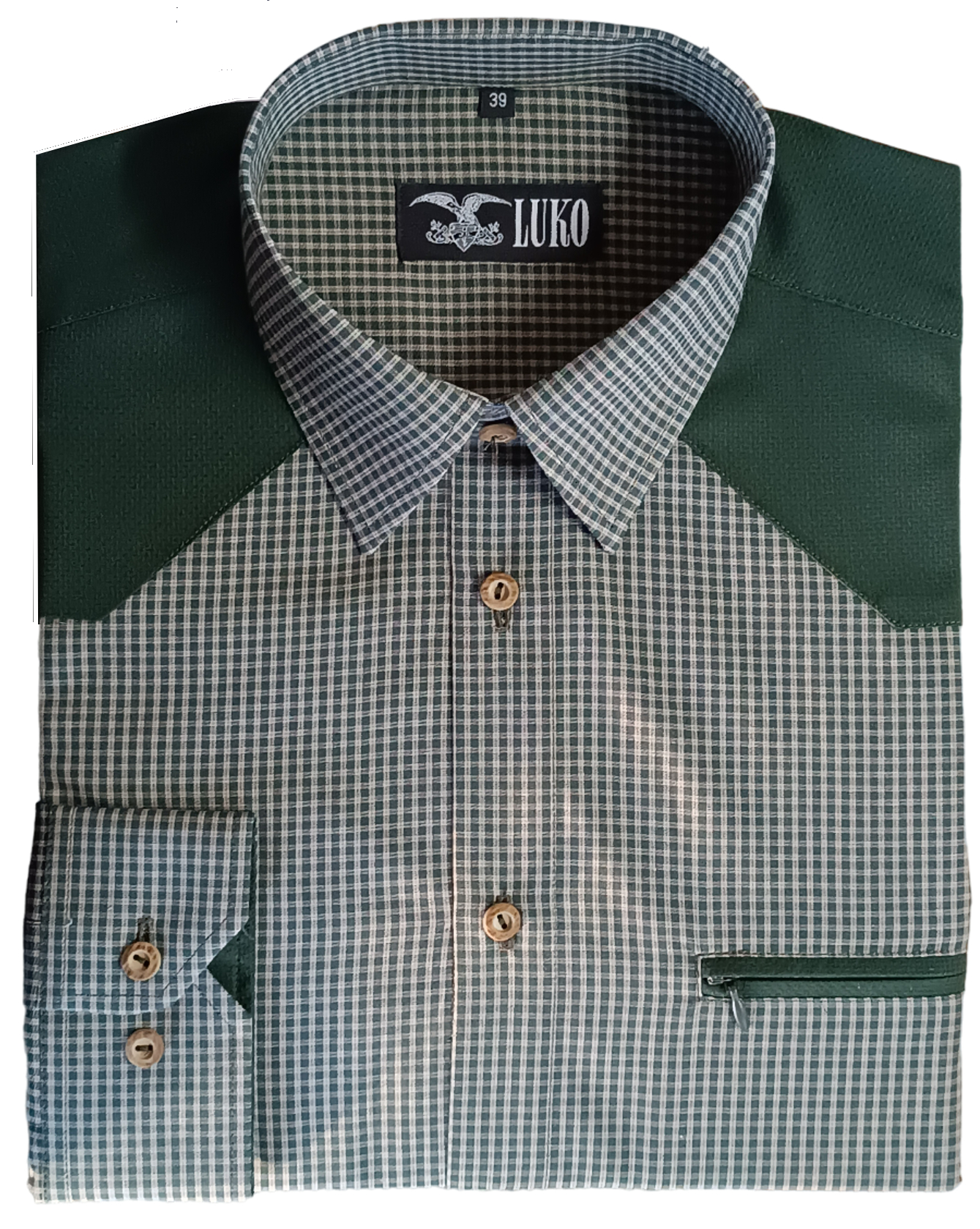 Knoflíky jsou z imitace paroží (stálobarevné a samozřejmostí je náhradní knoflík), košile má rovný střih a jednu pasovanou kapsu.