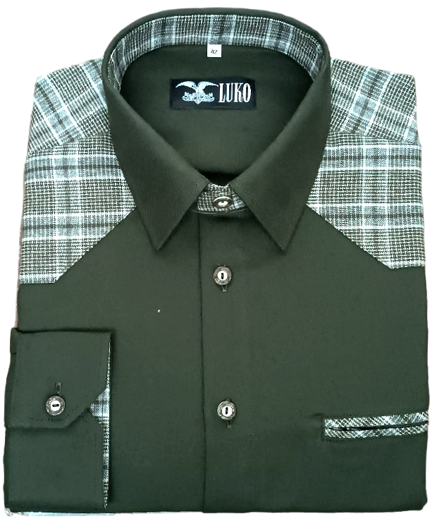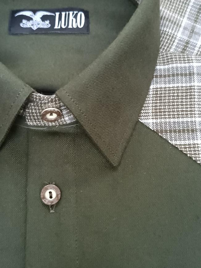 Základní tmavě zelený odstín doplňuje výrazná kostka v přírodních tónech, která decentně zdobí límec, ramena i kapsičku. Tento kontrast dodává košili osobitý charakter a zároveň zachovává její tradiční myslivecký vzhled.