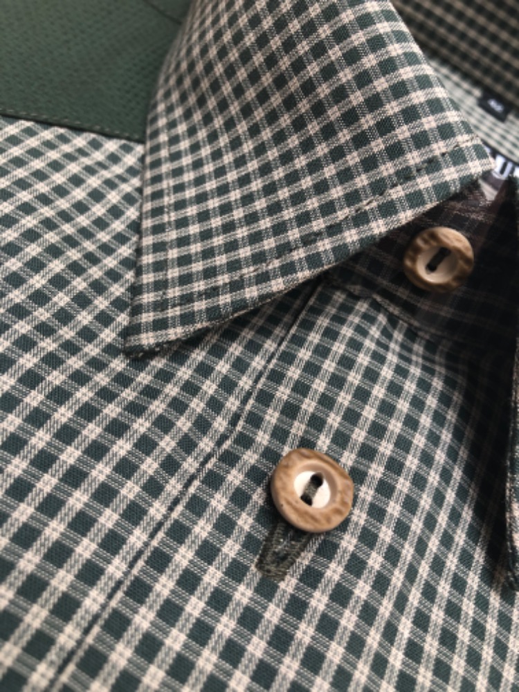 Knoflíky jsou z imitace paroží (stálobarevné a samozřejmostí je náhradní knoflík), košile má rovný střih a jednu kapsu se zapínáním na zip.