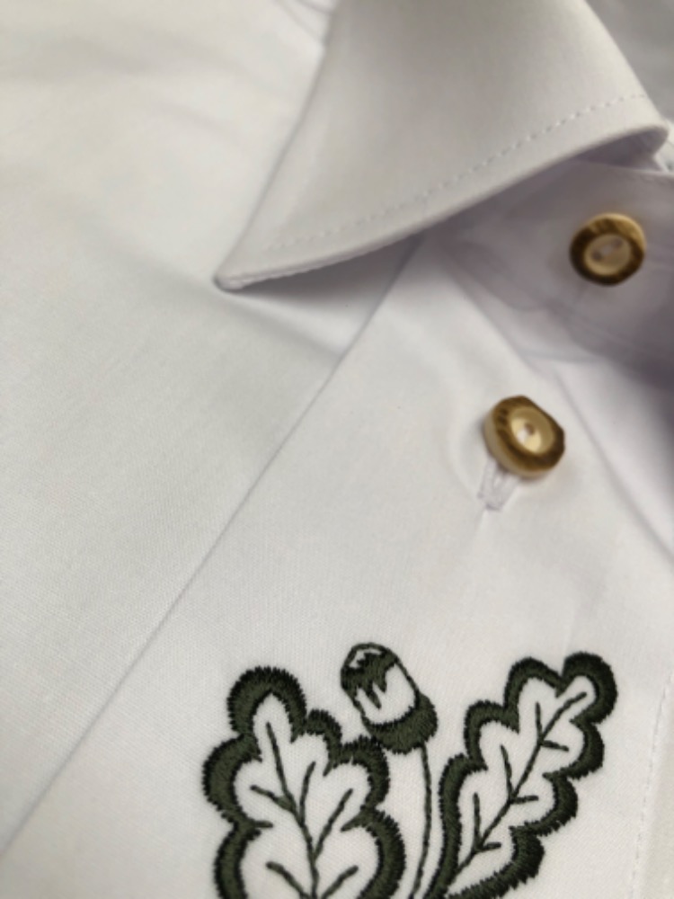 Knoflíky jsou z imitace paroží (stálobarevné a samozřejmostí je náhradní knoflík), košile má rovný střih a jednu pasovanou kapsu.