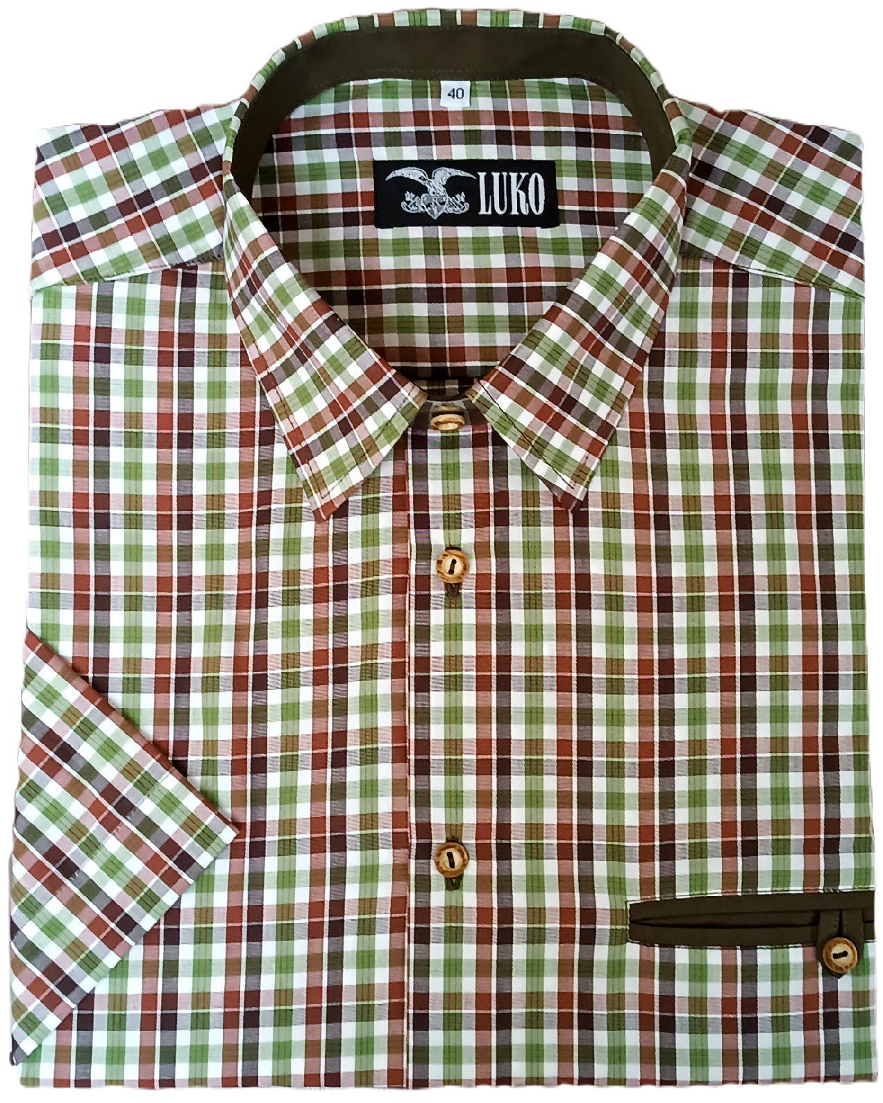 Knoflíky jsou z imitace paroží (stálobarevné a samozřejmostí je náhradní knoflík), košile má rovný střih a jednu výpustkovou kapsu se zapnutím na knoflík.