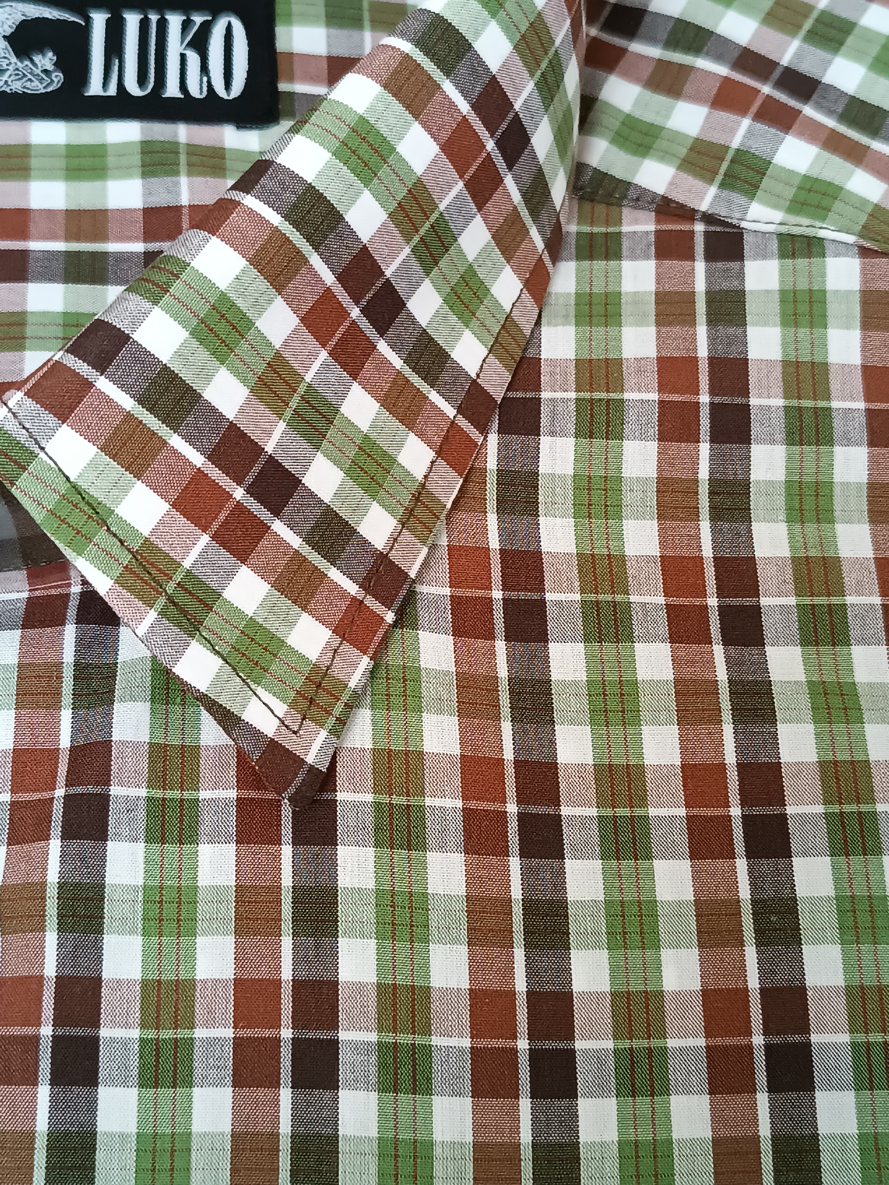 Pánská košile s krátkým rukávem ze 100% bavlny. Materiál je v provedení zeleno béžové sportovní káro.