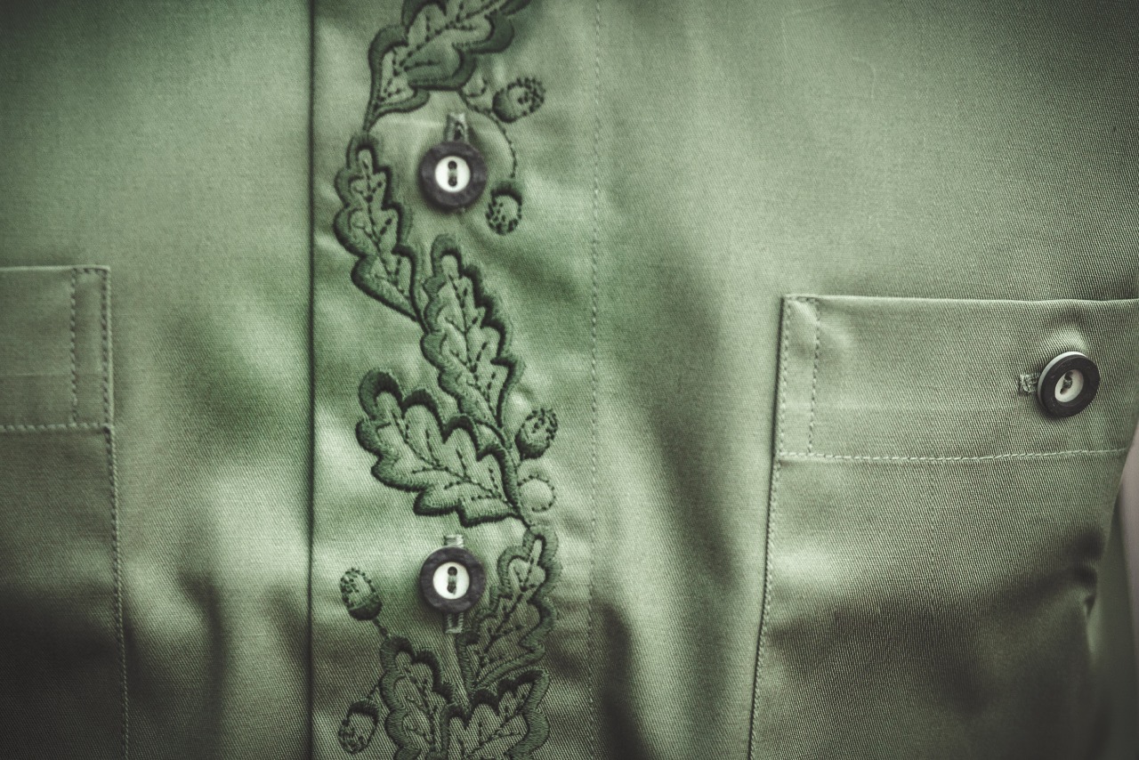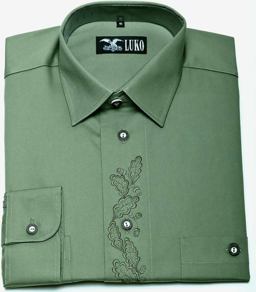 Pánská košile ze směsového materiálu 98% bavlna/2% lycra s elegantní výšivkou s motivem dubových lístků. Barevné provedení - světle zelená / tmavě zelená. Košile má větší gramáž s jemným chloupkem na povrchu. Díky tomu je vhodná na nošení zejména v chladných dnech. Díky přídavku lycry se téměř vůbec nemačká a nemusí se žehlit. Košile má rovný střih a dvě kapsy s možností zapnutí na knoflík.