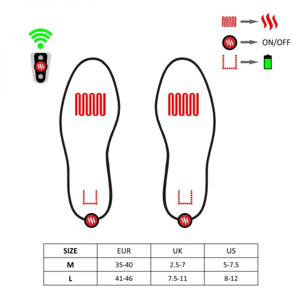 Vyhrievané vložky s ovládačom Glovii GW2 Vás zahrejú v tých najchladnejších dňoch počas mrazov a zimy. Či už idete na poľovačku, turistiku, lyžovačku alebo športovať v zimnom období zahrejú Vás kdekoľvek. Vložky Glovii majú vysoký výkon ohrevu až 44 ° C a extra výdrž až 7 hodín. Veľká plocha vykurovacieho telesa v prednej časti rovnomerne distribuuje teplo, upokojuje a zahrieva vaše nohy. Vložky Glovii GW2 maju v spodnej časti zabudovanú 1 800 mAh batériu, ktorá sa nabíja cez USB. Sada obsahuje diaľkové ovládanie, vďaka čomu je komfort používania mimoriadny. Termoaktívna tkanina umožňuje rýchle vstrebávanie vlhkosti a má biostatické vlastnosti, vďaka čomu podporuje činnosť vykurovacieho systému. Vyhrievané vložky Glovii GW2 sa dajú ovládať aj manuálne pomocou tlačidla v zadnej časti.